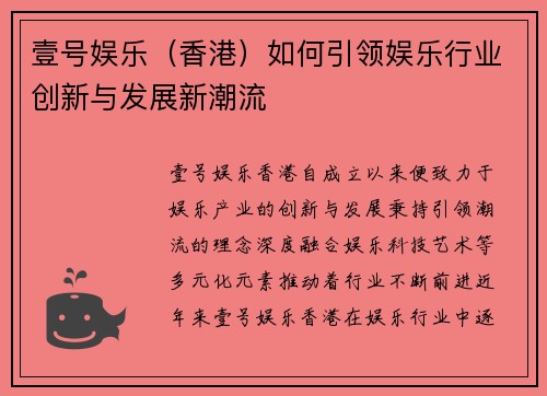 壹号娱乐(香港)自成立以来,便致力于娱乐产业的创新与发展,秉持“引领潮流”的理念,深度融合娱乐、科技、艺术等多元化元素,推动着行业不断前进。近年来,壹号娱乐(香港)在娱乐行业中逐步占据了重要地位,并在多个方面展现出了其引领潮流的独特方式。本文将从以下四个方面详细探讨壹号娱乐(香港)如何引领娱乐行业创新与发展新潮流:创新型娱乐内容的制作、技术融合与跨界合作、全球化发展与市场布局、社交互动与用户体验优化。通过这四个方面的分析,可以全面了解壹号娱乐如何引领娱乐行业的创新浪潮,并且为未来行业发展提供深刻的启示。