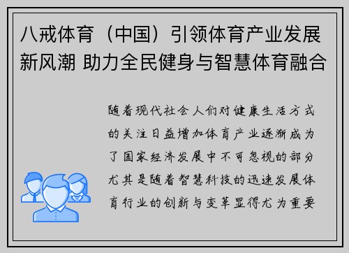 随着现代社会人们对健康生活方式的关注日益增加,体育产业逐渐成为了国家经济发展中不可忽视的部分。尤其是随着智慧科技的迅速发展,体育行业的创新与变革显得尤为重要。在这一背景下,八戒体育(中国)凭借其创新的技术手段和行业洞察力,成功引领了体育产业的新风潮,推动了全民健身与智慧体育的深度融合。本文将围绕八戒体育(中国)如何通过四个主要方面,全面助力体育产业的现代化发展,并推动全民健身的普及和智慧体育的创新进行详细阐述。具体包括八戒体育如何推动科技与体育融合、智慧体育技术如何提升全民健身的参与感与效果、如何通过大数据助力体育产业精准化发展,以及如何打造未来智能化体育生态等方面的详细探讨。